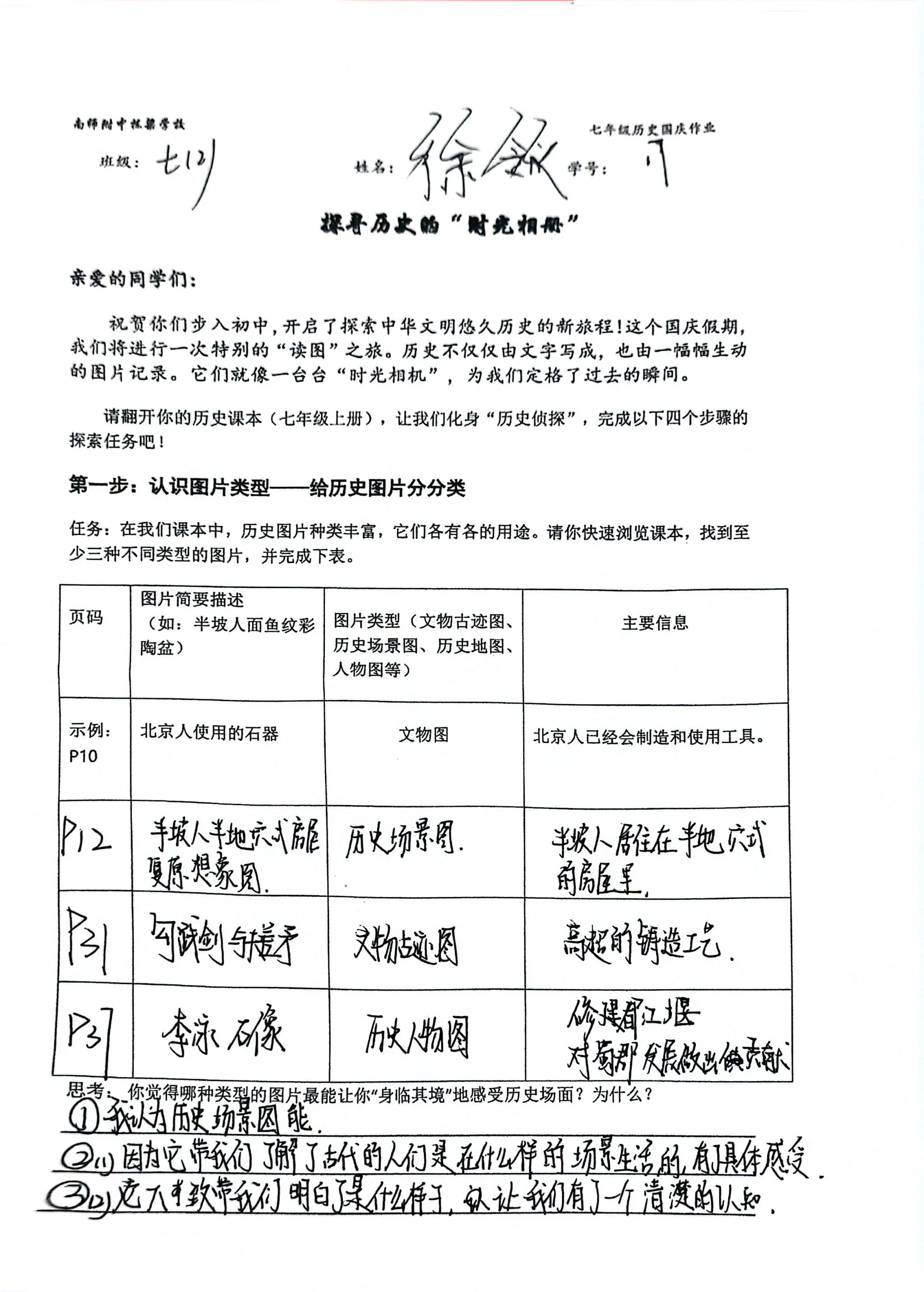 这个国庆假期,七年级的同学们以一场特别的“读图”之旅,开启了他们对中华文明的探索。一份精心设计的假期作业,不仅串联起课本中的历史图像,更在分类、解析与创造中,悄然培育着学生的核心素养。