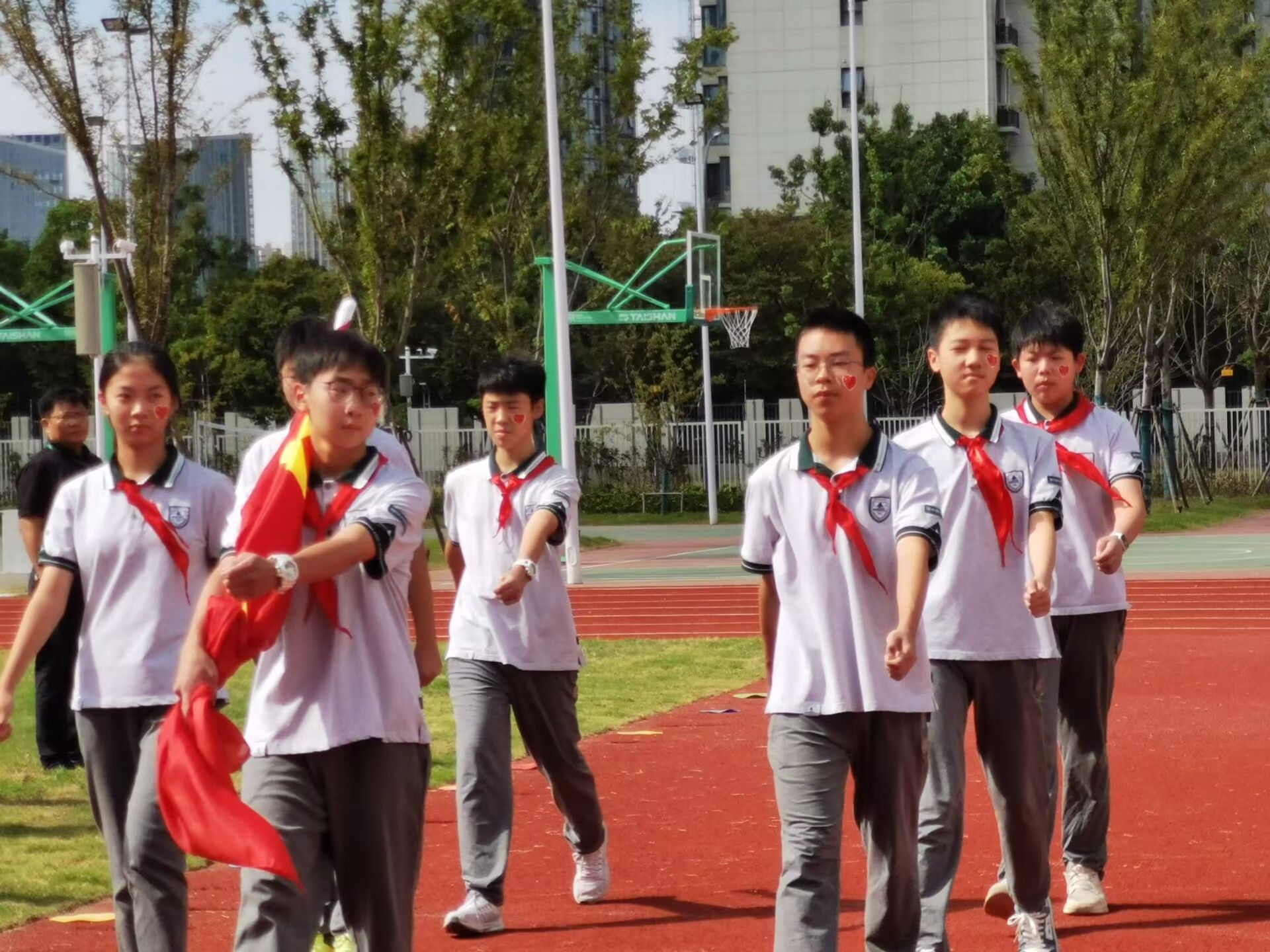 “出旗!”口令声落,国旗班队员护卫着那面鲜艳的五星红旗,走向旗台。 “升国旗,奏唱国歌!”全体师生凝视着国旗冉冉升起,那抹红色在湛蓝的天空中猎猎飞扬,一如76年来从未褪色的信仰,一如新时代少年胸腔里最炽热的情感。