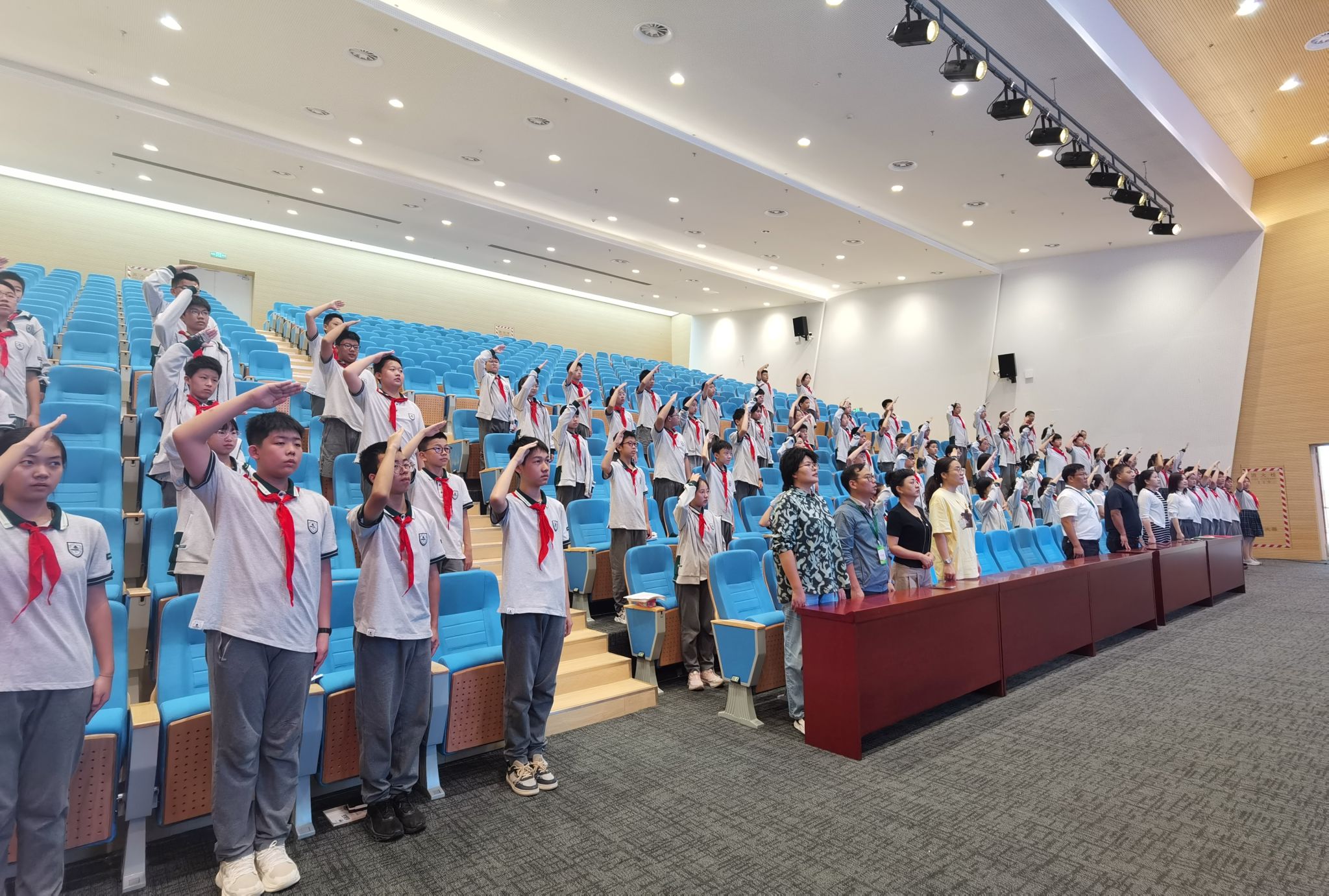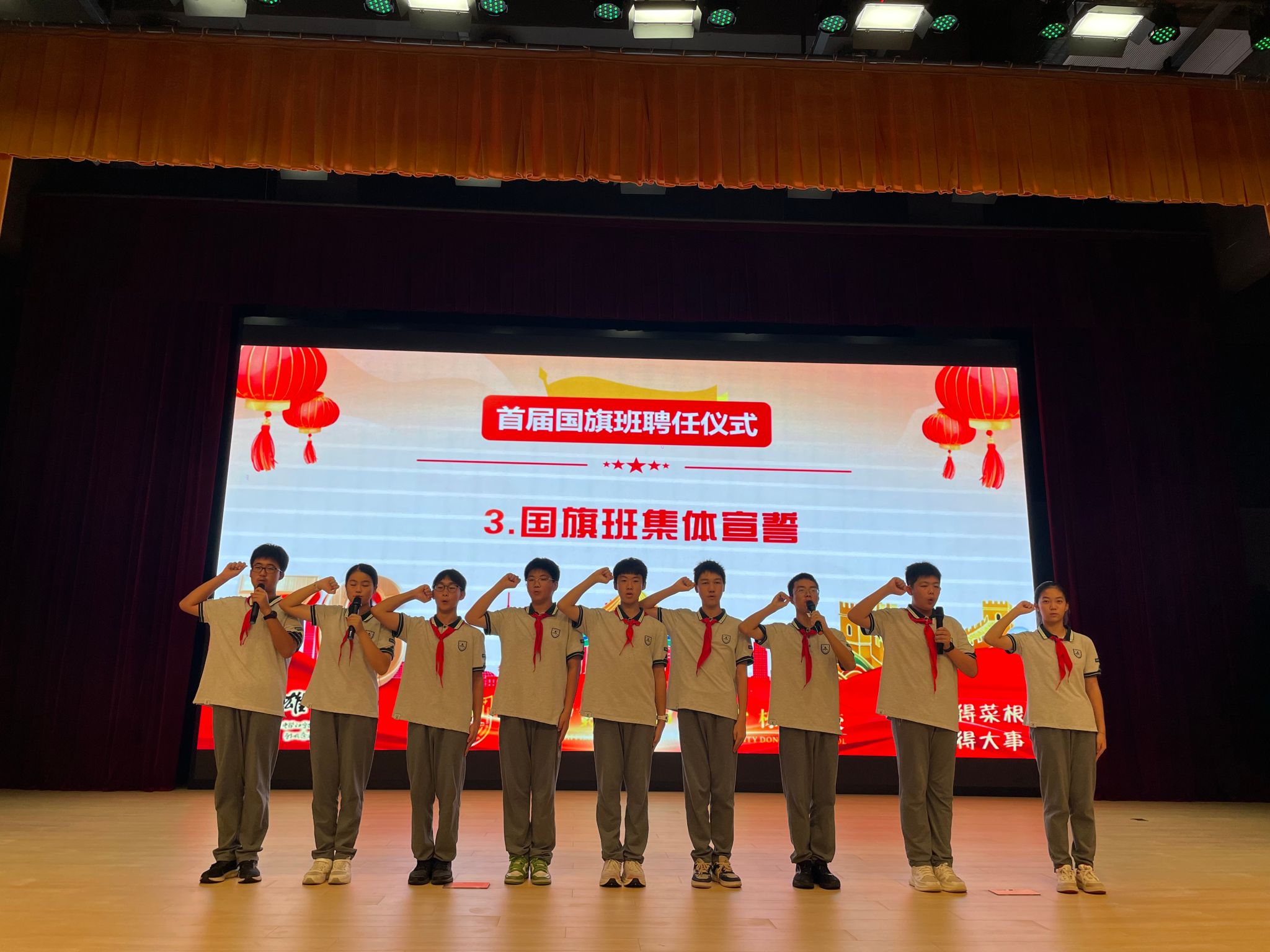 随后,全体国旗班同学庄严宣誓:“我光荣加入国旗班,庄严承诺:以青春热血,守护国旗尊严;团结奉献,恪尽职守;不负信任,不辱使命。诚朴雄伟,做栋梁学子表率!”铮铮誓言回荡在校园上空,展现了国旗班成员的责任与决心。国旗班的成立,标志着校园爱国主义教育迈向规范化、常态化,也将成为校园中一道庄严而流动的风景。