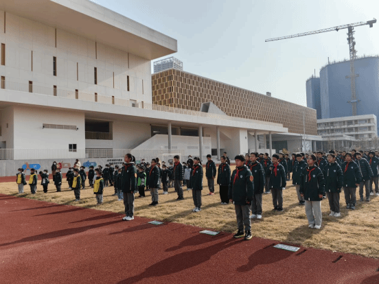 开幕式上首先举行升旗仪式,在庄严的国歌声中,初一(1)班吴钒同学和丁筱然同学将五星红旗冉冉升起。