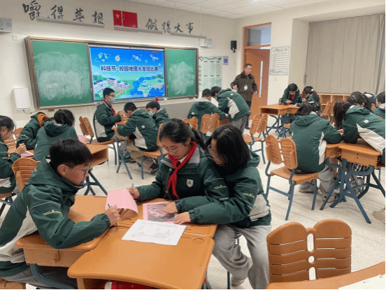 在“学海起航·校园地理大发现”比赛中,学生三人一组,手持校园平面图展开脑力角逐。随着裁判一声令下,各组迅速研究起手中绘有神秘坐标点的地图。整个比赛现场洋溢着强烈的探索欲。同学们时而集中讨论,时而在图纸上快速勾画标记,将世界地图上的坐标知识巧妙“嫁接”到熟悉的校园空间来。这场脑力角逐考验着同学们对地理知识的实际应用,以及空间想象力和团队协作能力。参赛同学感慨地说:“感觉像是在解密一场神秘游戏,很有趣!”